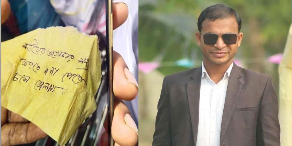 বরগুনার আমতলী উপজেলার হরিদ্রাবাড়িয়া গ্রামে ‘বউয়ের অত্যাচার সহ্য করতে না পেরে চলে গেলাম’ বলে চিরকুট লিখে আম গাছের সঙ্গে গলায় ফাঁ*স দিয়ে আত্মহ*ত্যা করেছেন নজরুল ইসলাম নামে এক স্কুল শিক্ষক। শনিবার (৭ সেপ্টেম্বর) সকালে বরগুনার আমতলী উপজেলার হরিদ্রবাড়িয়া গ্রামে এ ঘটনা ঘটে। স্কুল শিক্ষক হরিদ্রবাড়িয়া গ্রামের নজরুল ইসলাম খালেক খানের ছেলে।