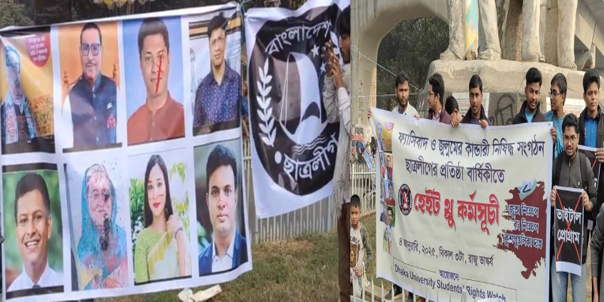 ঢাকা বিশ্ববিদ্যালয়ে (ঢাবি) ছাত্রলীগের ৭৭তম প্রতিষ্ঠাবার্ষিকী উপলক্ষে ‘হেইট থ্রু’ নামে একটি প্রতিবাদ কর্মসূচি পালিত হয়েছে। কর্মসূচিতে নিষিদ্ধ সংগঠন ছাত্রলীগ এবং আওয়ামী লীগের কেন্দ্রীয় নেতাদের ছবি সংবলিত ব্যানারে জুতা নিক্ষেপ করেন ঢাবির শিক্ষার্থীরা।