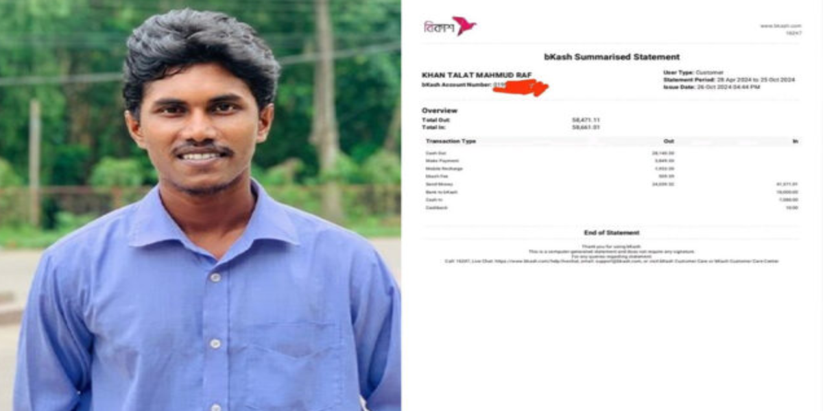সম্প্রতি অনলাইন সংবাদমাধ্যম ডেইলি বাংলাদেশের একটি প্রতিবেদনে দাবি করা হয়েছে, বৈষম্যবিরোধী ছাত্র আন্দোলনের সহ-সমন্বয়ক খান তালাত মাহমুদ রাফির ব্যক্তিগত বিকাশ অ্যাকাউন্টে (০১৯৯৫৮৮৭১**) আগস্ট থেকে অক্টোবর মাসের মধ্যে ৬১ লাখ ৩২০ টাকা লেনদেন হয়েছে। এ ছাড়া, মায়ের জাতীয় পরিচয়পত্র দিয়ে খোলা আরেকটি অ্যাকাউন্টে (০১৭০৯১৯৭৩**) লেনদেন হয়েছে ৩১ লাখ ৯০ হাজার ৩৫ টাকা। তবে রিউমর স্ক্যানারের অনুসন্ধানে এই তথ্য মিথ্যা প্রমাণিত হয়েছে।
