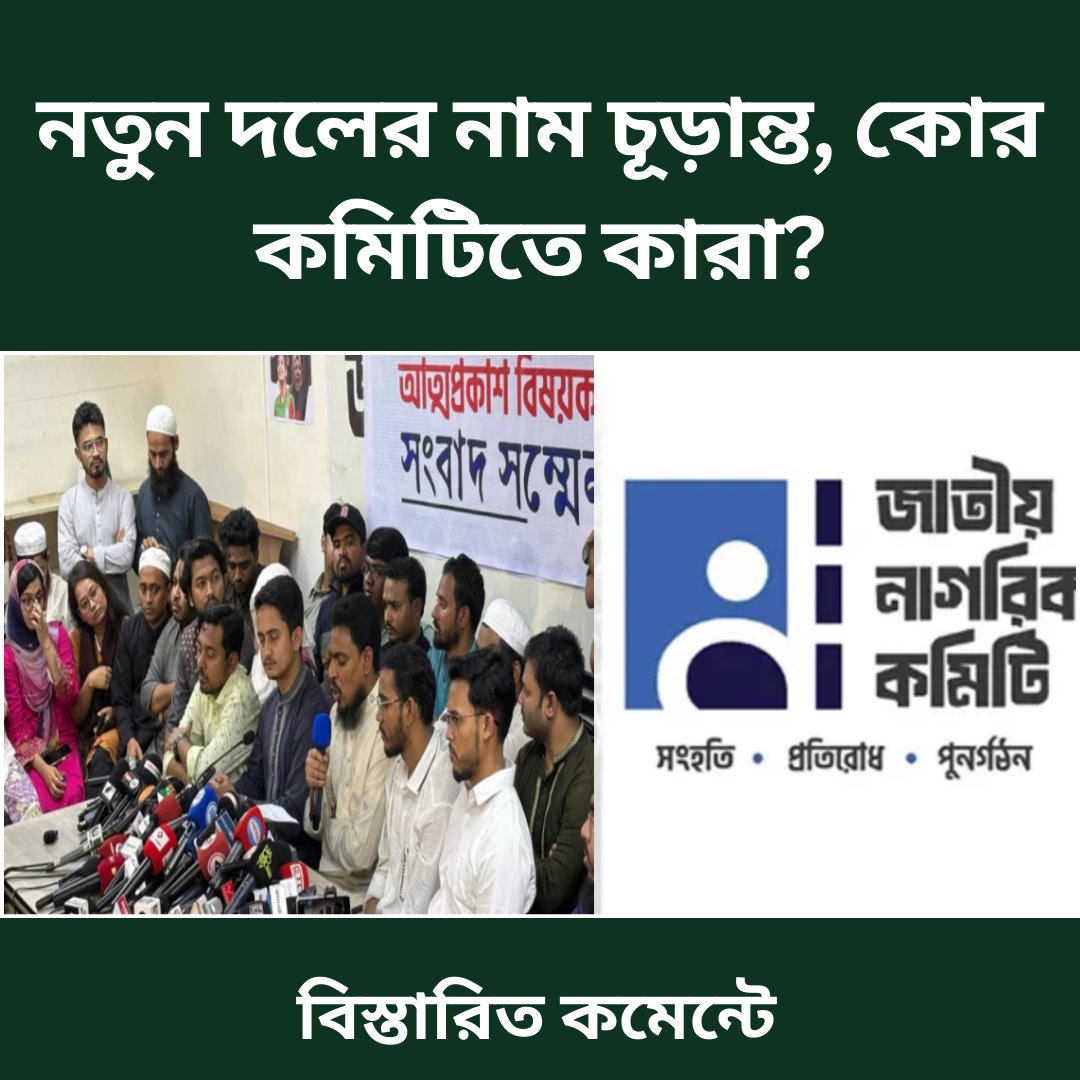 ছাত্রআন্দোলনের শীর্ষ নেতাদের সঙ্গে কথা বলে মানবজমিন জানতে পেরেছে যে, নতুন রাজনৈতিক দলের নাম ‘বাংলাদেশ গণতান্ত্রিক নাগরিক শক্তি’ নির্ধারণ করা হয়েছে। কেন্দ্রীয় কমিটির সদস্য সংখ্যা হবে ১৫১ জন, আর কোর-কমিটি গঠিত হবে ২৪ সদস্যের একটি দল নিয়ে। জাতীয় নাগরিক কমিটির এক শীর্ষ নেতা নাম প্রকাশ না করার শর্তে বলেছেন, “দলের নাম ও কেন্দ্রীয় কমিটি চূড়ান্ত হয়েছে। কিছু গুরুত্বপূর্ণ পদ নিয়ে এখনো আলোচনা চলছে। তবে আমরা নিশ্চিত করতে চাই যে, এটি একটি অন্তর্ভুক্তিমূলক রাজনৈতিক শক্তি হবে, যেখানে ধর্ম-বর্ণ-জাতি নির্বিশেষে সবাই অংশগ্রহণের সুযোগ পাবেন, এবং নারী নেতৃত্বেরও যথেষ্ট গুরুত্ব থাকবে।”