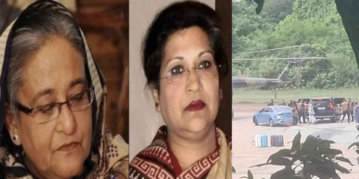 এরপর শেখ হাসিনা তার ছোট বোন রেহানাকে নিয়ে তেজগাঁওয়ের পুরাতন বিমানবন্দরের হেলিপ্যাডে পৌঁছান। সেখানে পদত্যাগের আনুষ্ঠানিকতা সম্পন্ন করার পর শেখ হাসিনা দুপুর আড়াইটার দিকে একটি সামরিক হেলিকপ্টারে তার ছোট বোনকে নিয়ে ভারতে উড়ে যান।